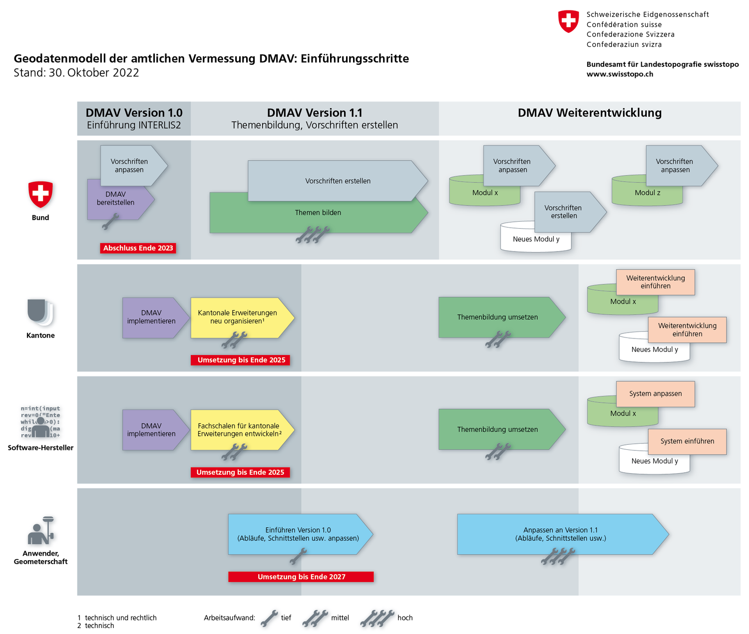 - Frühester Termin für die schweizweite Einführung des neuen Geodatenmodells DMAV Version 1.0.