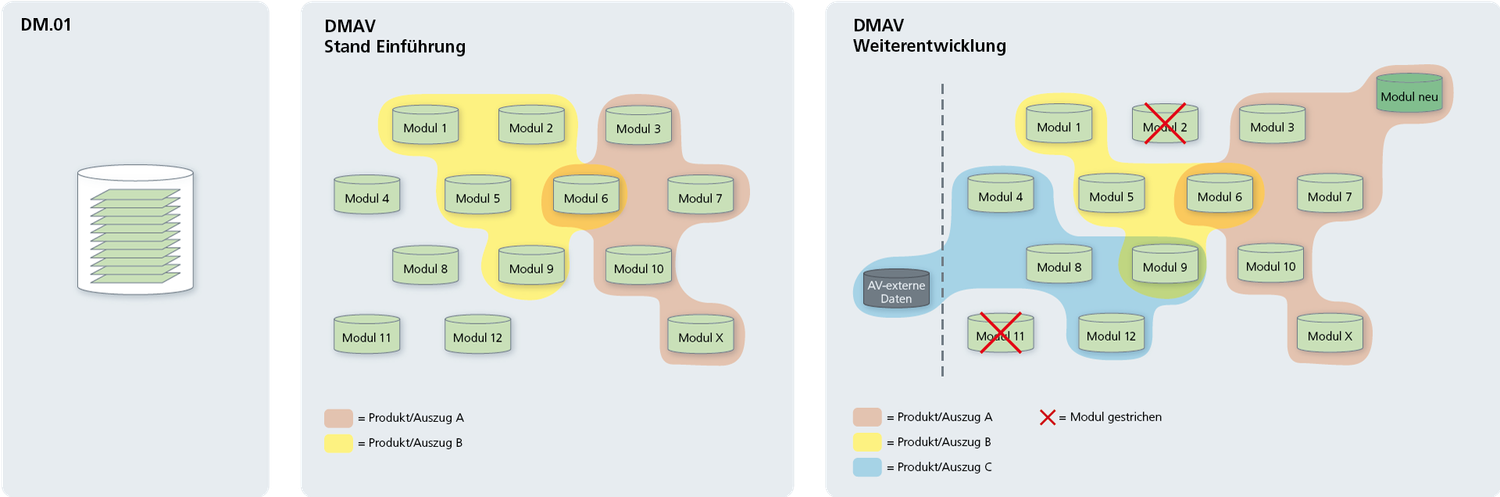 Das neue Geodatenmodell der amtlichen Vermessung DMAV soll für künftige Anforderungen gerüstet sein und behält dennoch die bisherigen Stärken bei. Die Umsetzung dieser Zielsetzung erfolgt mittels eines Wechsels von einem statischen zu einem modularen Geodatenmodell. Bedarf es einer Anpassung beschränkt sich diese jeweils auf ein Modul des Geodatenmodells. In der ersten Fassung des DMAV wird der Inhalt des Geodatenmodells nicht wesentlich verändert. Modifiziert wird lediglich die Struktur des Modells, um es für künftige Änderungen bereit zu machen.